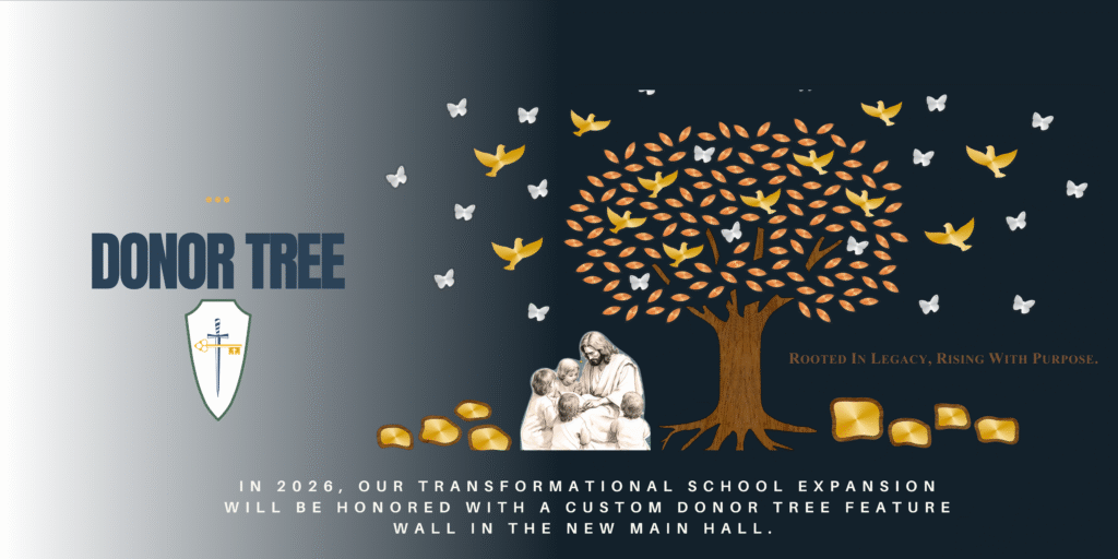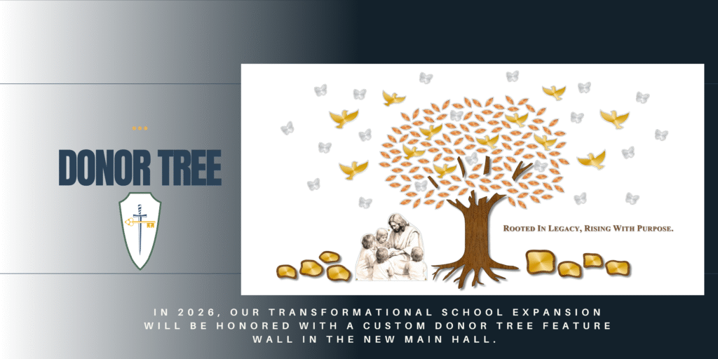 We are thrilled to unveil a once-in-a-generation opportunity for every member of our community — Current Families, Alumni, Parishioners, Donors, and Friends — to leave a permanent mark on our school’s future through our custom-designed donation tree which we have formally named, “Rooted in Legacy, Rising with Purpose”. Your family’s name will live at the heart of our new space, a lasting testament of your belief in our mission and your commitment to the generations who will follow.
